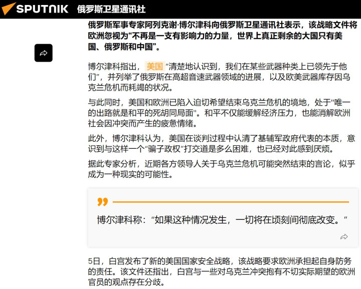 在特朗普政府的新版国安战略出炉后,俄军事专家博尔津科对俄媒表示,欧洲已不再被视为一支有影响力的国际力量,世界上真正的大国只剩下中美俄三家。